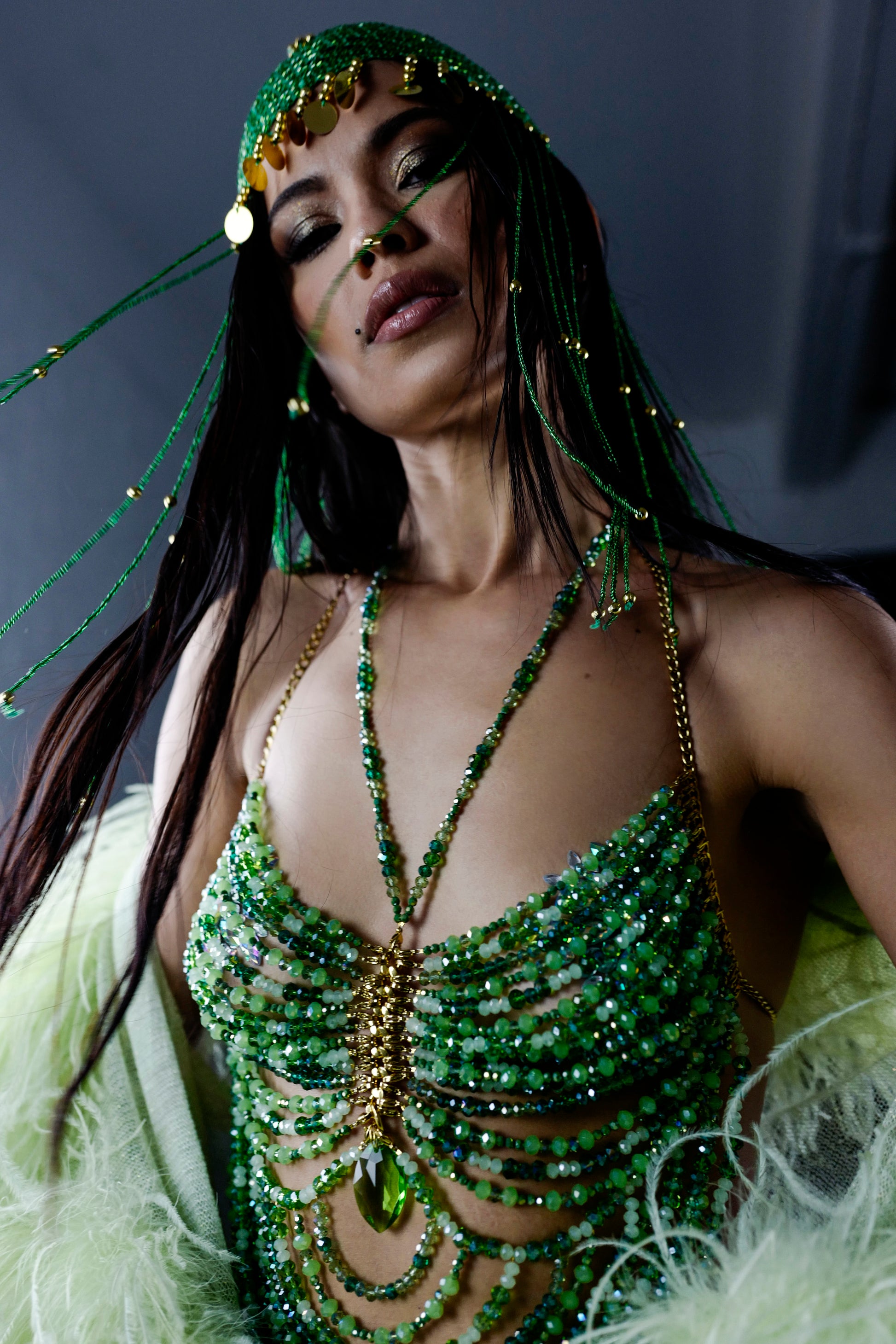 The top features a mix of green toned beads and  crystal beading throughout.